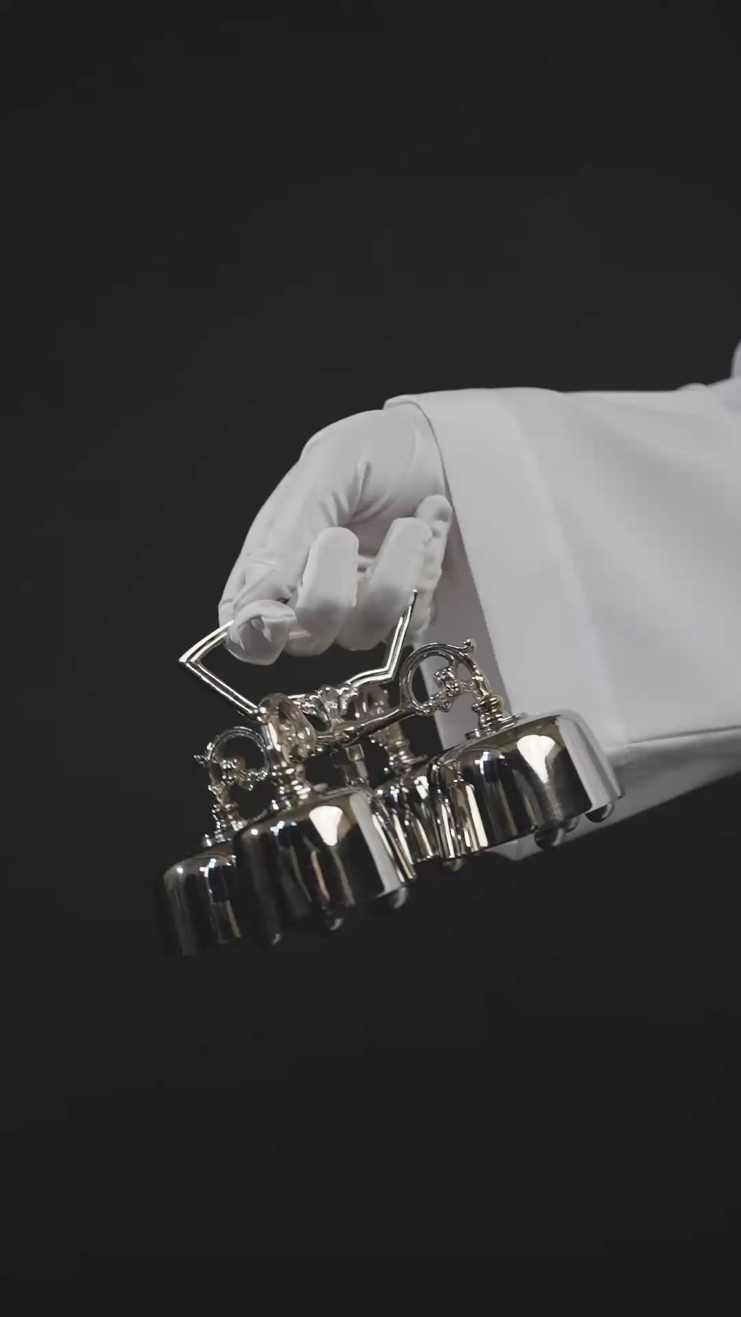 Questi eccezionali campanelli quadrupli sono una combinazione di eleganza, funzionalità e simbolismo. Realizzati in ottone e nichel, di colore argento delicato, creano un insieme armonioso il cui suono introduce un'atmosfera di sacra solennità. Uniti da un unico manico, i campanelli si distinguono per la loro straordinaria semplicità ed eleganza, essendo un perfetto accento per ogni cerimonia liturgica.