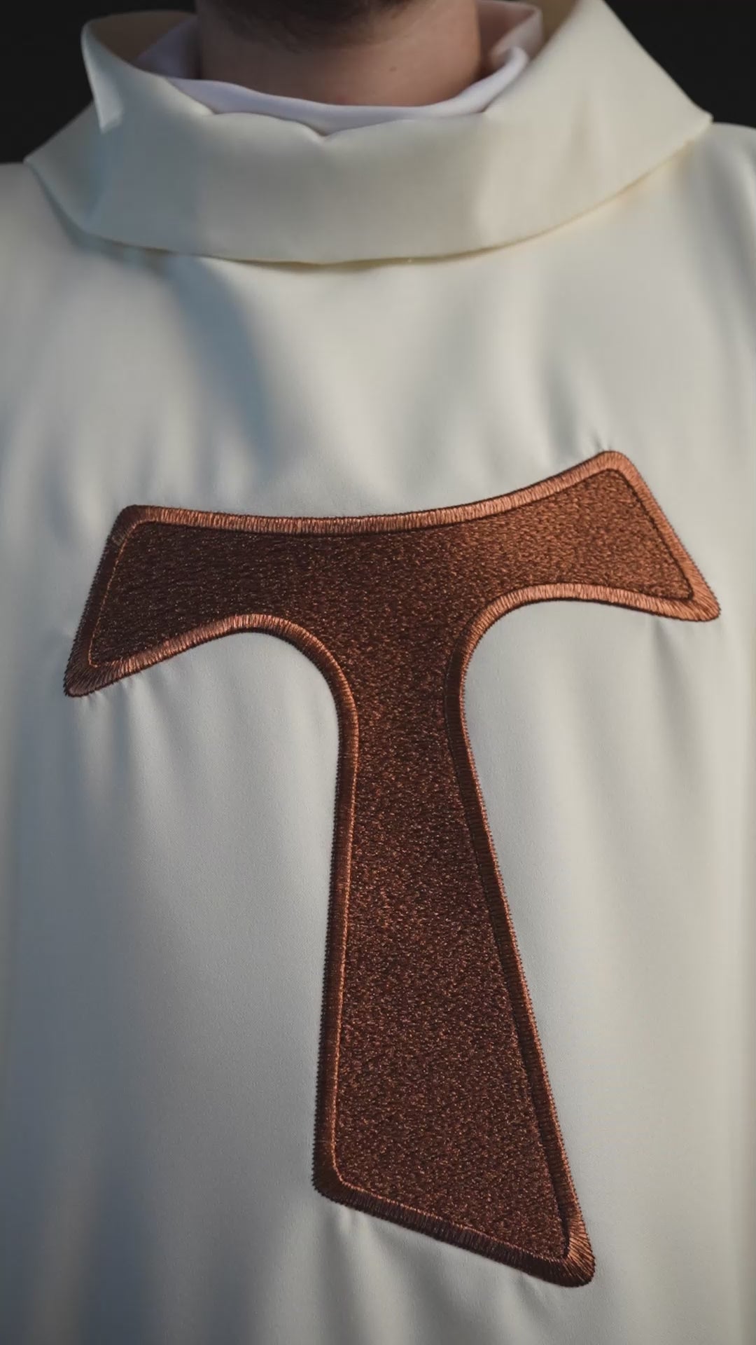 Casula realizzata in tessuto liscio di alta qualità, decorata con il simbolo della croce francescana TAU. Il tutto è rifinito con finiture in raso dorato. La nostra offerta comprende questa casula anche nella versione senza colletto.