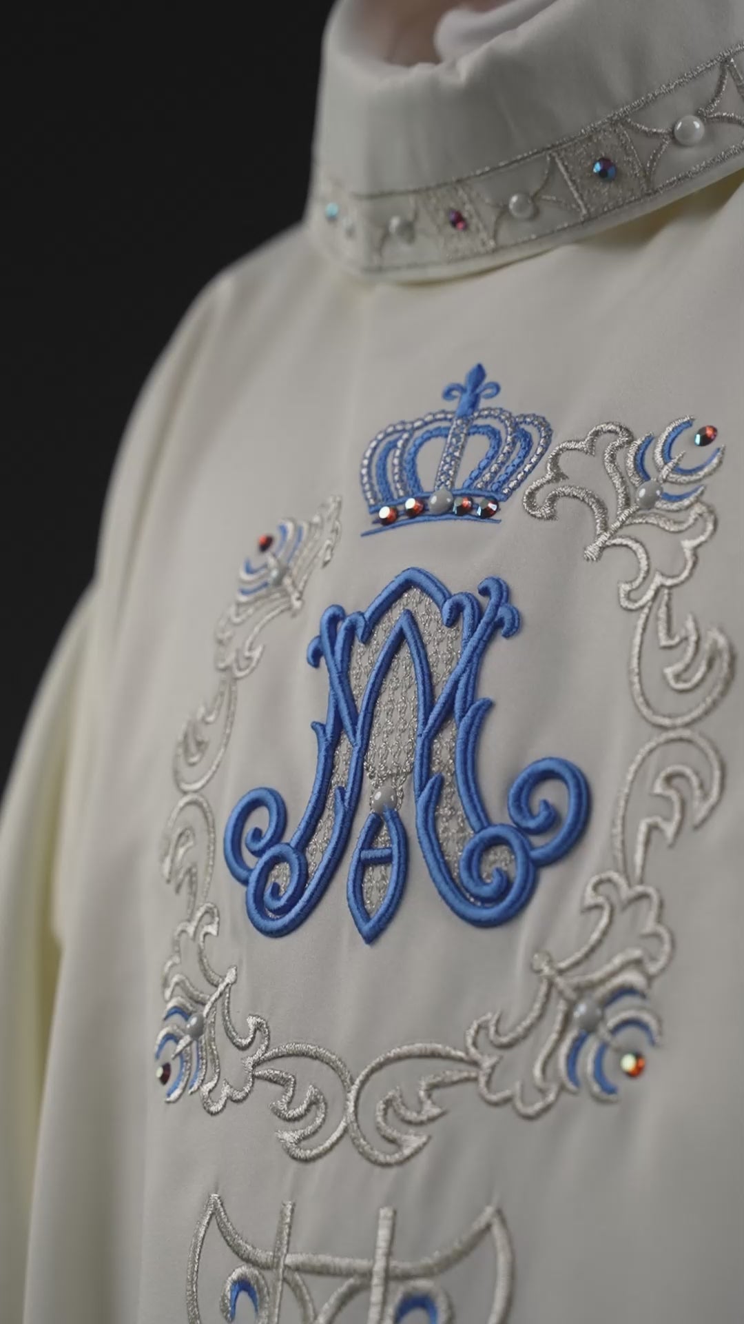 Immergiti in un'atmosfera di divina bellezza e celebrazione con la nostra Casula mariana, magistralmente realizzata per onorare la Beata Vergine Maria. La nostra casula è una combinazione di tessuto italiano di eccellente qualità, dettagli ricamati tempestati di perle e pietre e profondo rispetto per le tradizioni religiose.