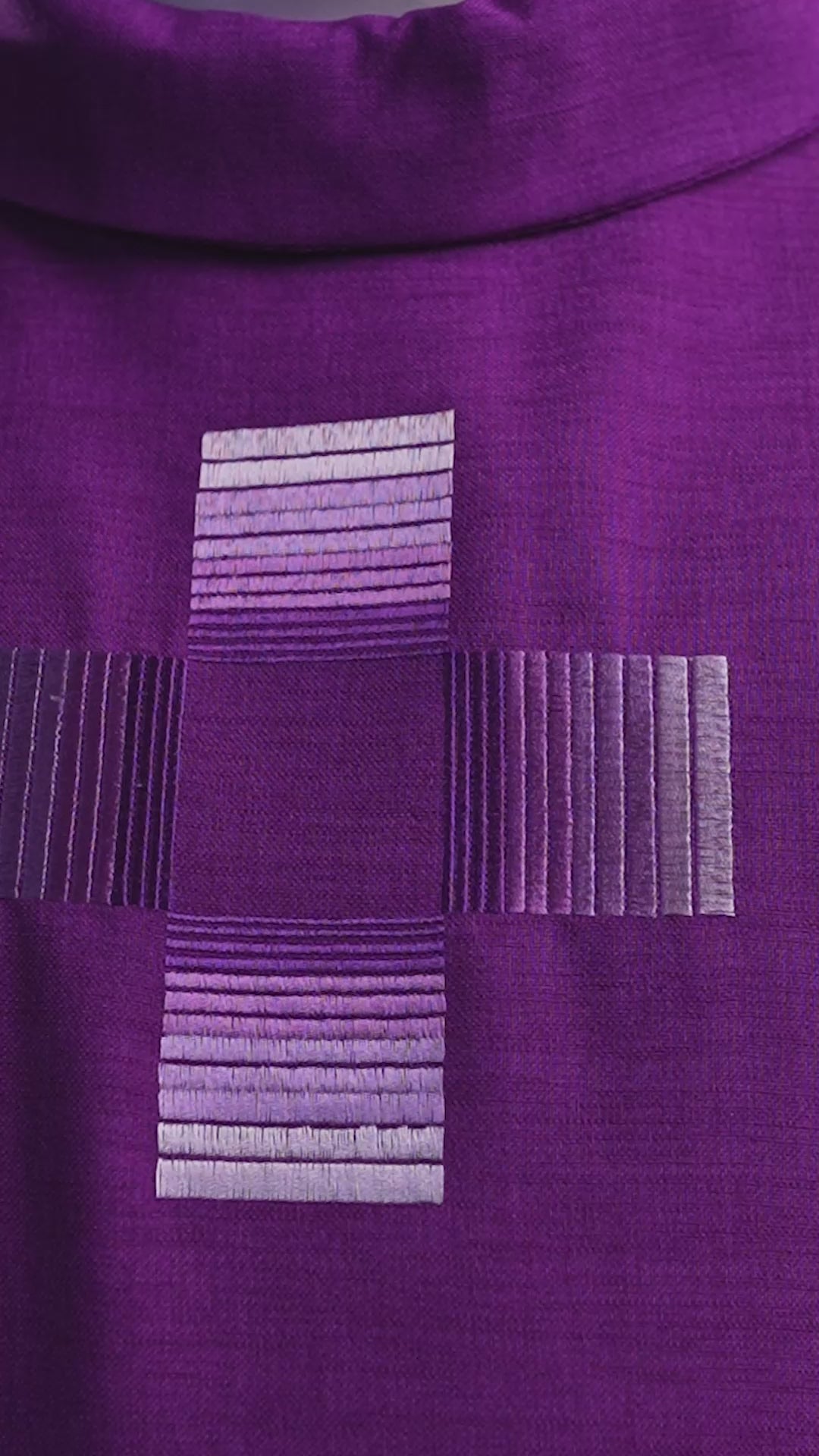 Il tessuto è realizzato al 100% in PE. La casula è inoltre decorata con ricami realizzati con fili d'argento, che raffigurano una croce. Il bordo color casula della veste impedisce al materiale di sfilacciarsi.