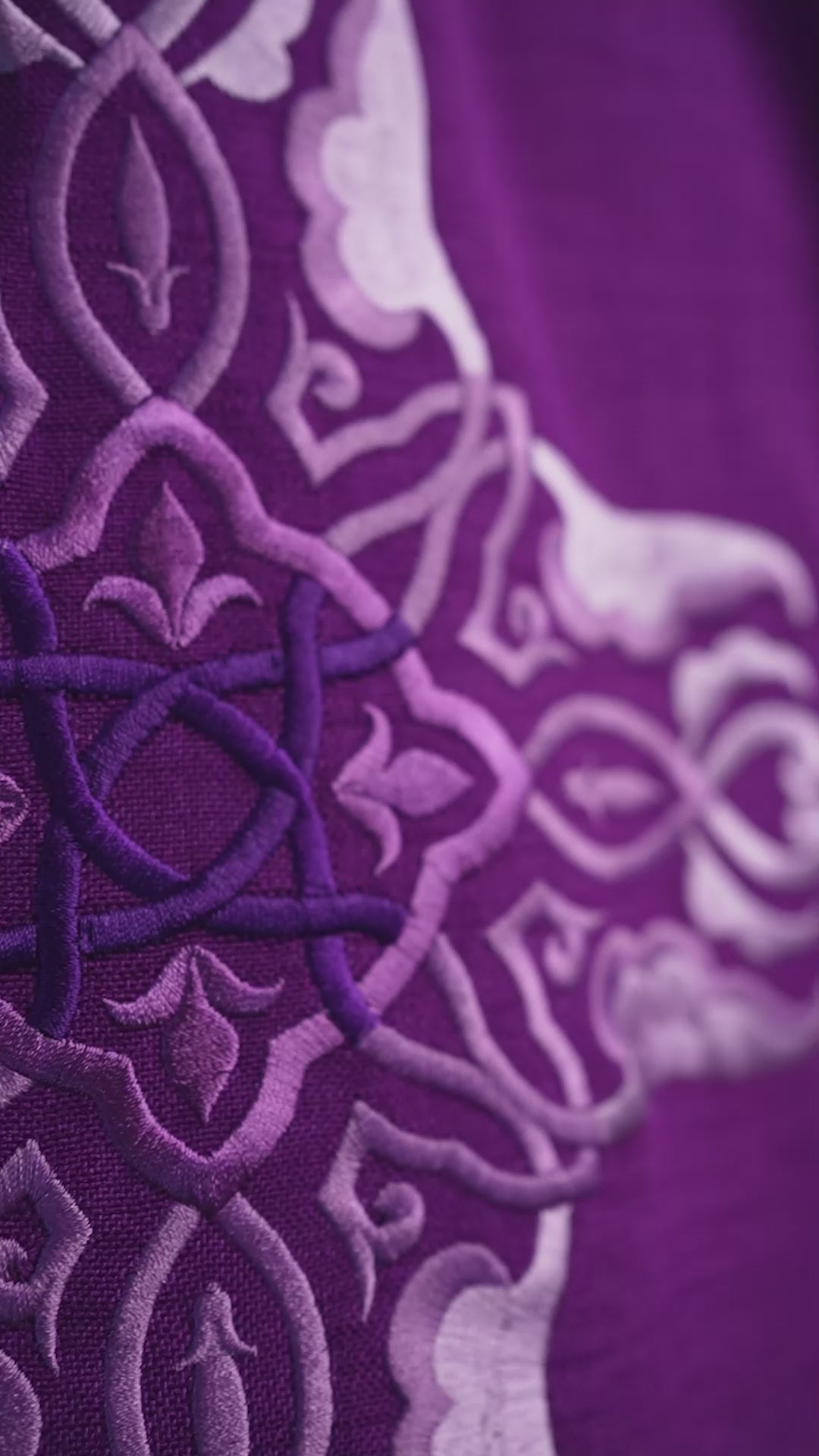 Il tessuto è realizzato al 100% in PE. La casula è inoltre decorata con ricami realizzati con fili d'oro, che rappresentano una croce. Il bordo color casula della veste impedisce al materiale di sfilacciarsi.