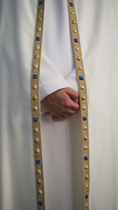Elegante copricapo liturgico realizzato con tessuto jacquard italiano di alta qualità con aggiunta di cotone. Sul retro è decorato con un ricamo mariano ricco nei colori oro e blu, simbolo di devozione e purezza. Il bordo decorativo con filo d’oro e pietre blu conferisce all’insieme un carattere unico e solenne.
